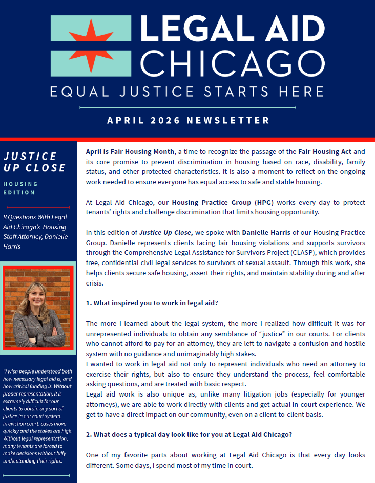 Thank you for visiting Legal Aid Chicago’s newsroom. Please click below to read our April 2026 Newsletter, featuring our Housing Practice Group.
