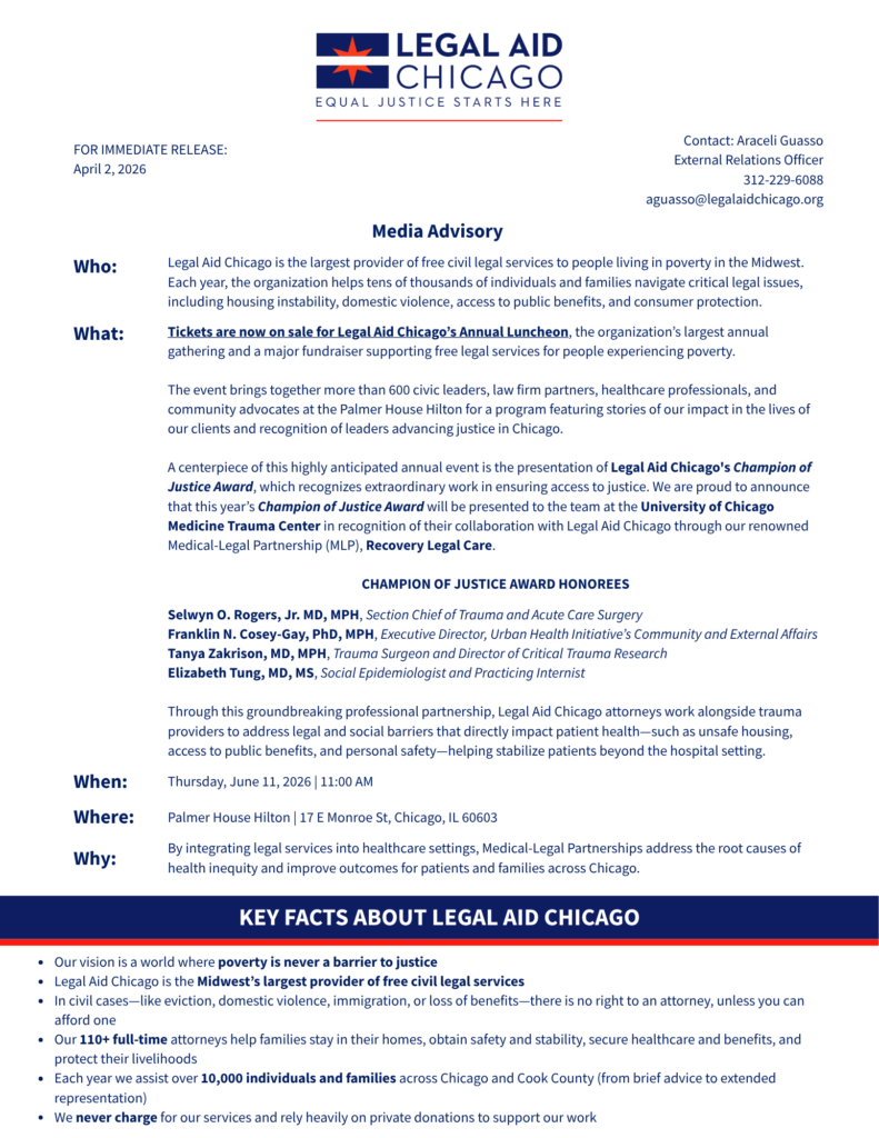 Legal Aid Chicago provides free legal assistance in civil cases to people living in Chicago and suburban Cook County.