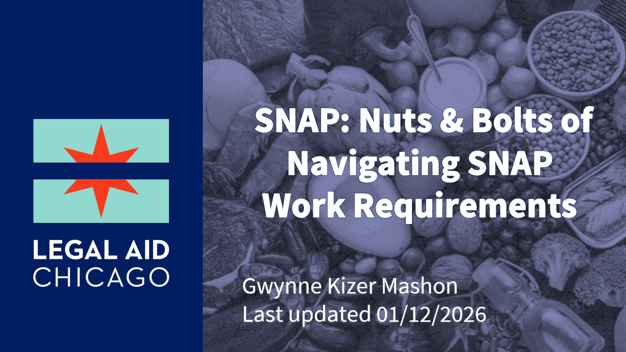 The trainings on this page are presented as educational resources to help low-income Illinois residents and service providers understand federal and state food, cash, and medical assistance programs. None of the information presented here is intended to be legal advice. If you are in need of legal assistance, please click here to apply for services online or call Legal Aid Chicago’s intake line at 312-341-1070.