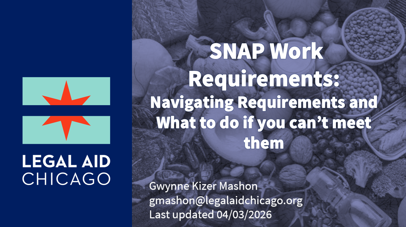 The trainings on this page are presented as educational resources to help low-income Illinois residents and service providers understand federal and state food, cash, and medical assistance programs. None of the information presented here is intended to be legal advice. If you are in need of legal assistance, please click here to apply for services online or call Legal Aid Chicago’s intake line at 312-341-1070.
